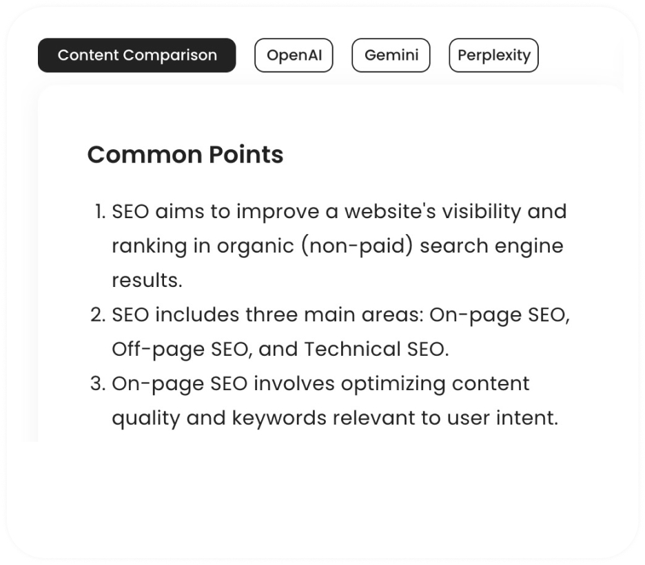 Our comparative analysis engine reveals consensus facts, unique findings, and even contradictions. Spot if your site is cited—or if your competitors are winning visibility.